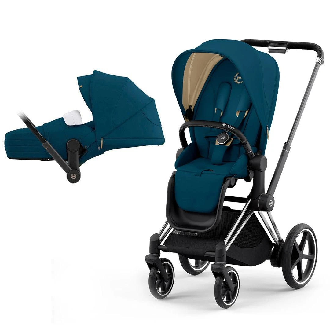 One frame; four travel options. depending on the age of the little ones, the e-Priam is compatible with the Lux Carry Cot, the Lite Cot, or the Cloud Z i-Size infant car seat (Available separately).