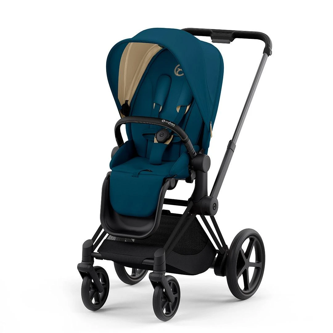 The CYBEX e-Priam Pushchair in Mountain Blue (2022) boasts an all-new free-of-charge CYBEX app, you can activate the rocking function, control the level of support from the electric motors and check your battery and firmware. The updated design and innovative new functionality make the e-Priam even more desirable.