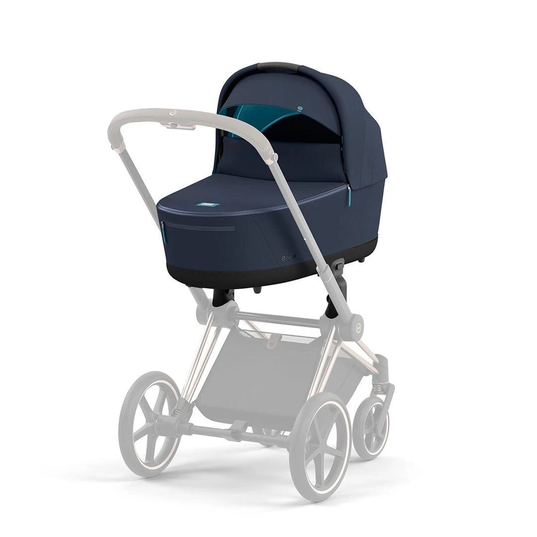 The CYBEX Priam Lux Carrycot in Nautical Blue is ideal for babies from birth until theyโre six months old. Simply click onto the 2022 CYBEX Priam and e-Priam chassis (sold separately) – perfect for sophisticated and comfortable family travelling. The spacious unit boasts generous dimensions and maximum comfort for baby.